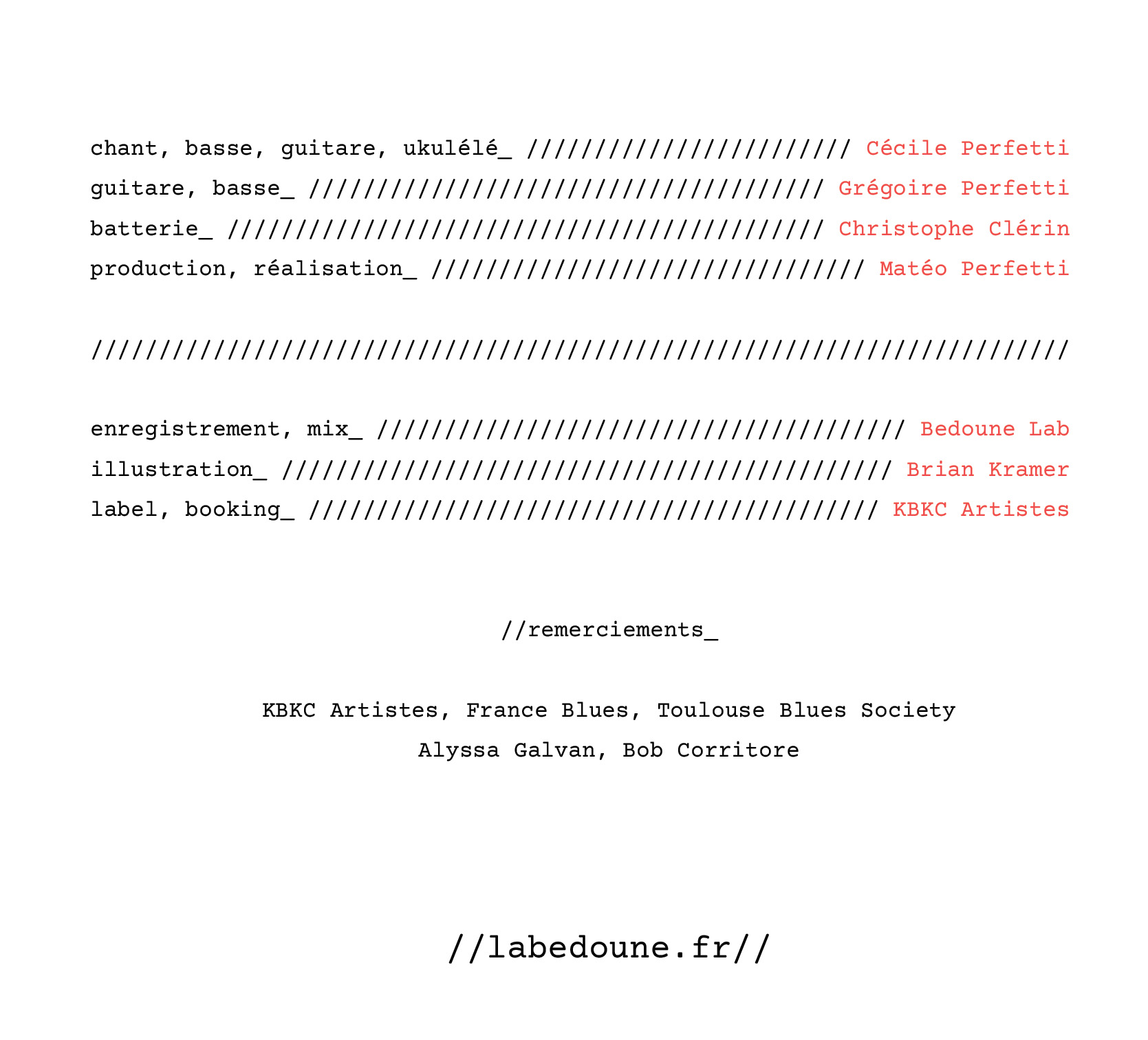 Pas évident de réussir dans le blues et dans les musiques afro-américaines en partant avec un tel bagage, et pourtant, La Bedoune a su convertir même les plus dubitatifs à sa cause, avec un talent fou bien entendu, la voix de Cécile et le son plein de velours de sa basse fretless se mariant à merveille au grain rugueux mais toujours harmonieux des guitares de Greg et aux percussions que l’une et l’autre assurent avec beaucoup de discernement. On appelle ça être des artistes complets !
